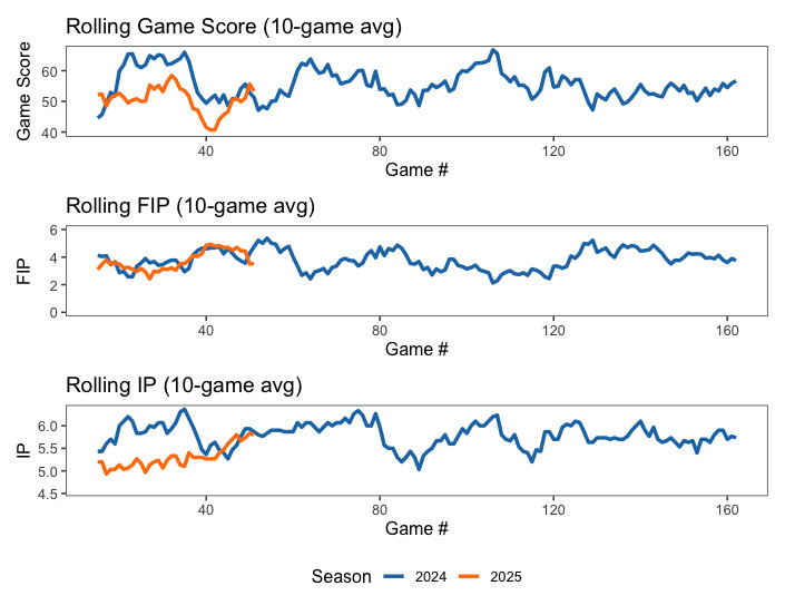 The rotation was to be the highlight of this roster. It’s been disappointing… so far. The Mariners rotation has a 3.64 FIP, which is top 10 in MLB and about identical to their FIP last year. But the rotation also ranks 18th in innings pitched, a year after finishing with the most in MLB. They rank 14th by fWAR. The following plot shows FIP, innings pitched, and game score rolled over 10 games. It highlights both the rotation’s early season struggles, and the potential this group holds.