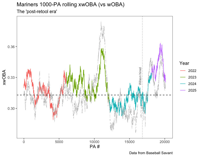 April was the Mariners best month of the Statcast era. They finished the first 30 games with a .353 xwOBA, besting a .352 mark set in August 2023. That “best offense in MLB” pace has not continued, and we can see the line has shifted back towards average in May.