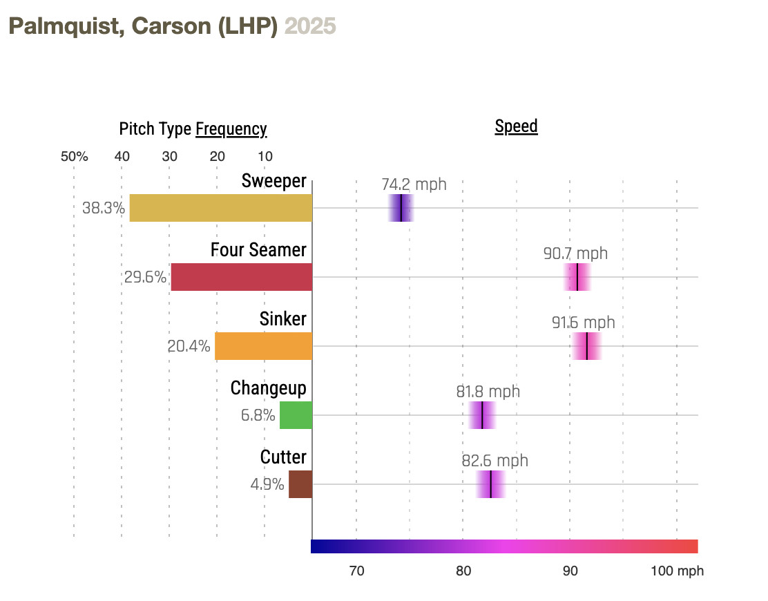 Carson Palmquist was the Rockies’ third-round pick in 2022 out of the University of Miami. He threw reasonably well in seven starts for Triple-A Albuquerque so the Rockies called him up and… yikes, the results have been bad. In two starts he’s allowed 16 hits, five walks and 11 earned runs in just 8⅓ total innings.