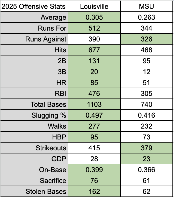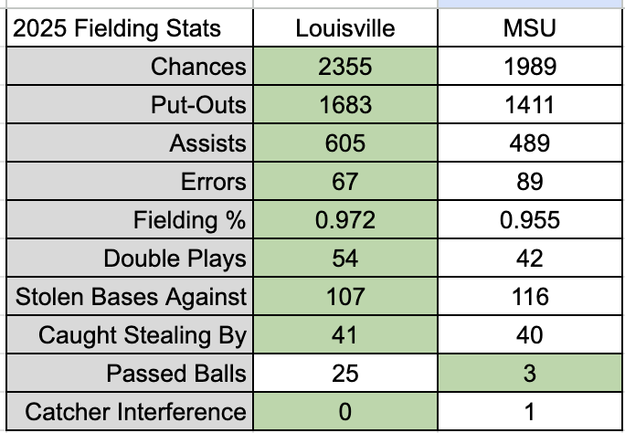 Offensively, and once the ball is in play, however, all favor the Cards. Louisville catchers need to block balls on the ground better, and the fielding would be a clean sweep of green in their favor. If a catcher is trusting a pitcher to find the zone, passed balls become much less of a worry. In terms of the batting order, Louisville outclasses Michigan State in nearly every category. Louisville may strike out more, but they again are facing elite pitching competition in the ACC, and are still able to vastly outclass the Spartans offensively – not to mention, Louisville made the Final Four while MSU got bounced in the Big Ten Tournament. More games, more innings. More quality competition.