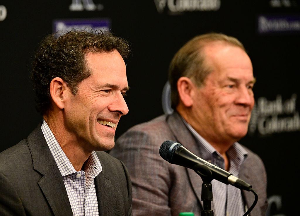 Colorado Rockies president of baseball operations Paul DePodesta, left, and Rockies owner Dick Monfort during DePodesta’s introductory press conference