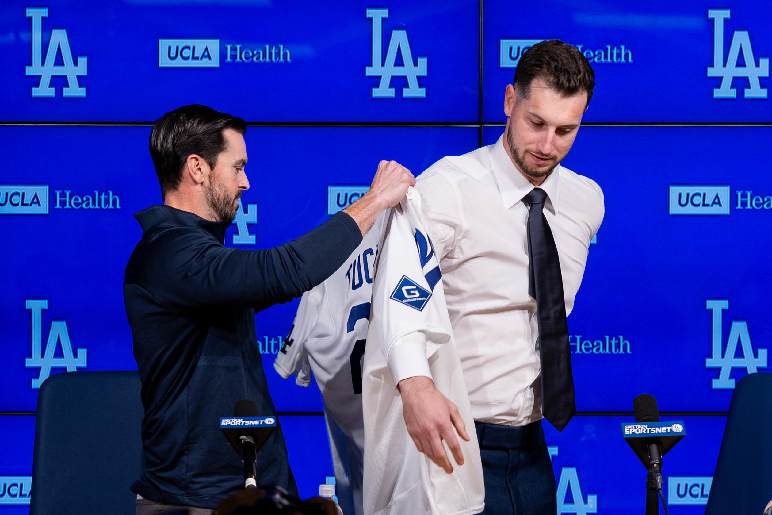 Brandon Gomes, Dodgers executive president and general manager, helps new outfielder Kyle Tucker put on a Dodgers jersey during a press conference