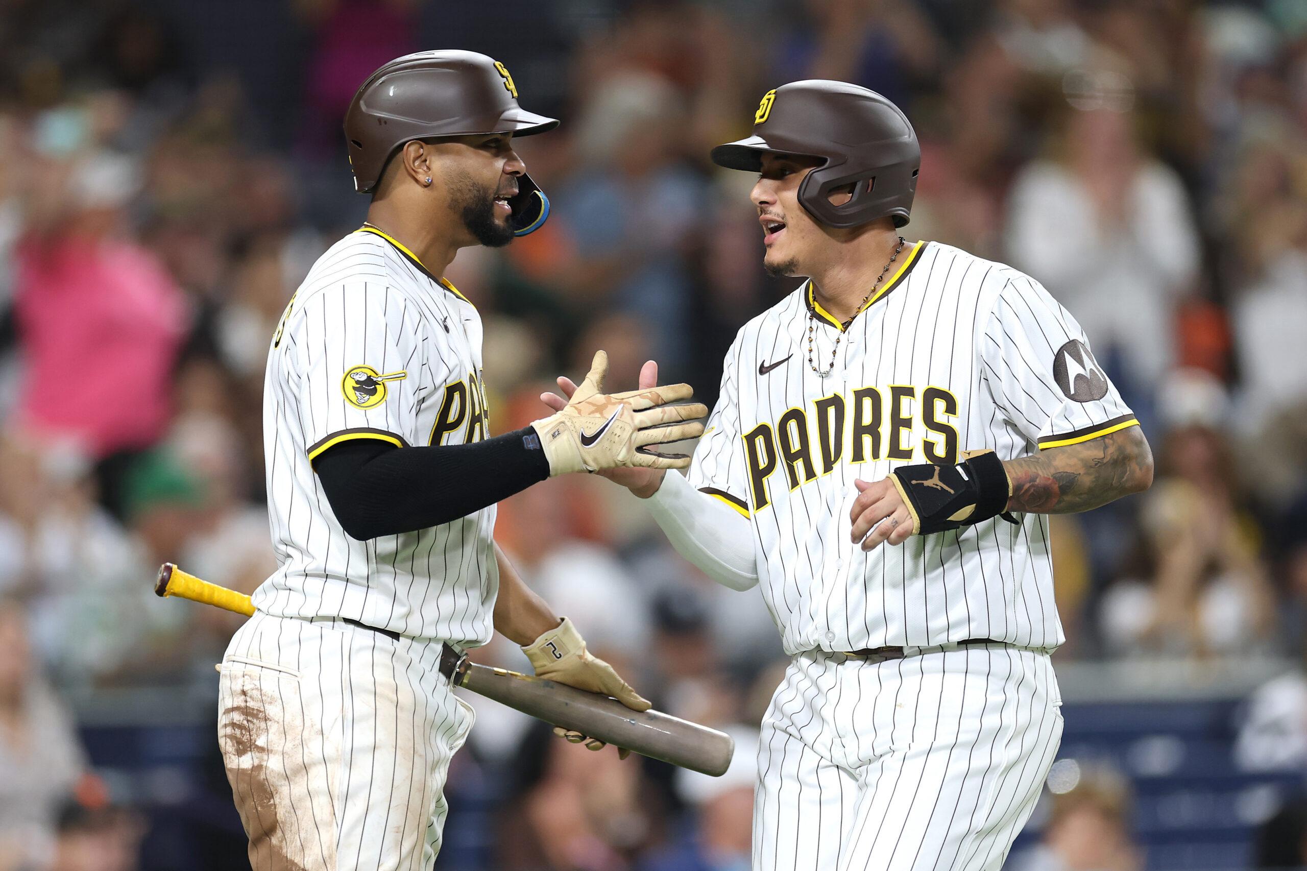 Xander Bogaerts congratulates Manny Machado after scoring on an RBI single by Ryan O’Hearn