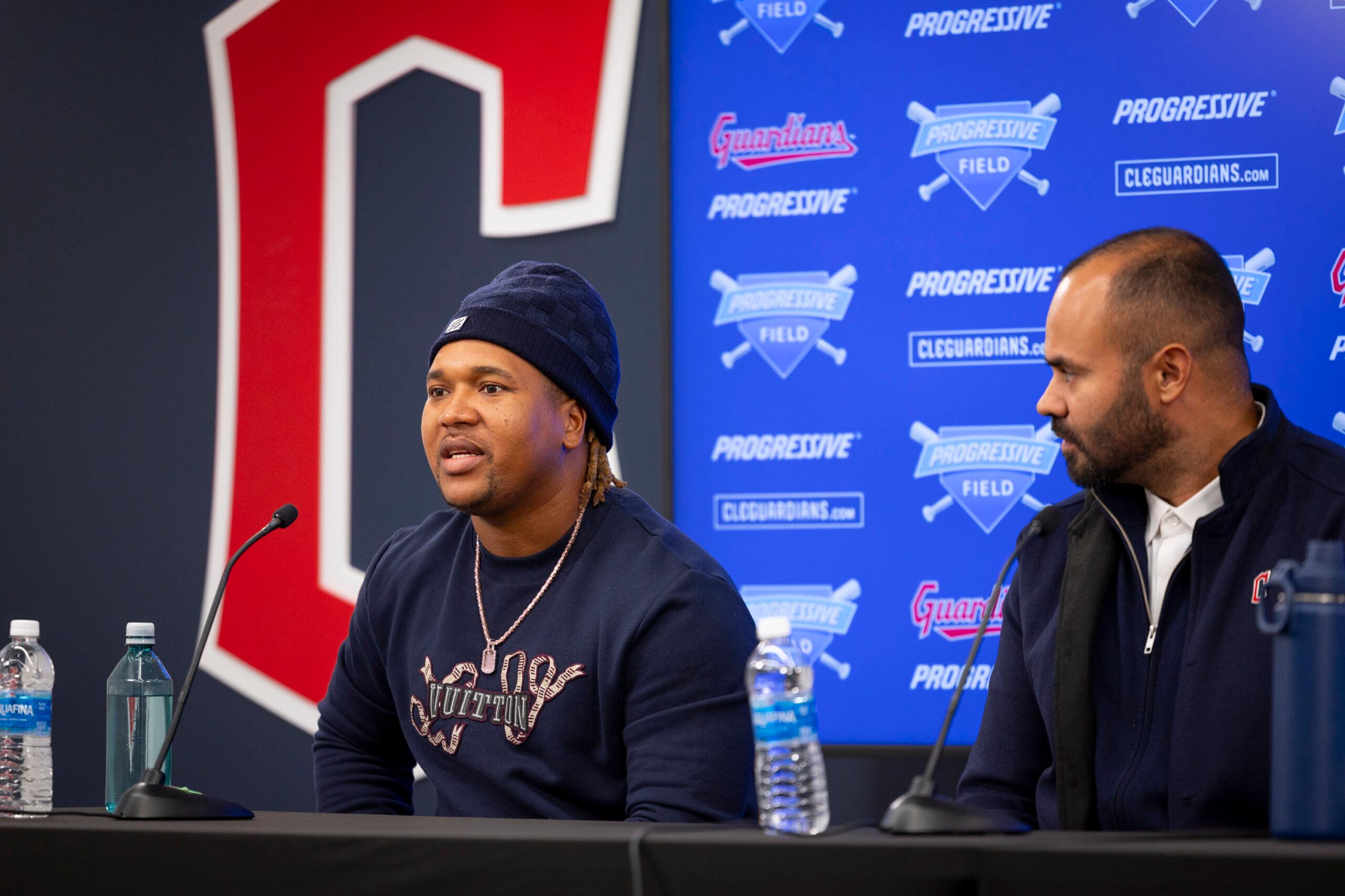Jose Ramirez attends a press conference announcing a new seven-year contract through 2032