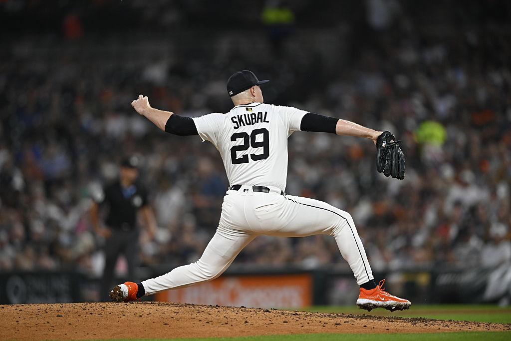 Tarik Skubal #29 of the Detroit Tigers throws a pitch during the fifth inning against the Houston Astros