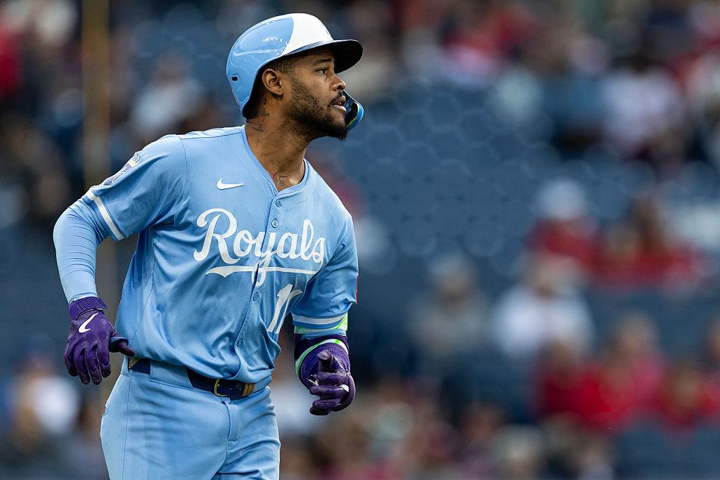 Maikel Garcia runs to first base during a game between the Kansas City Royals and the Cleveland Guardians