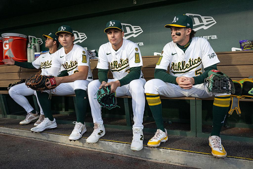 Tyler Soderstrom, JJ Bleday, and Jacob Wilson in the dugout before a game