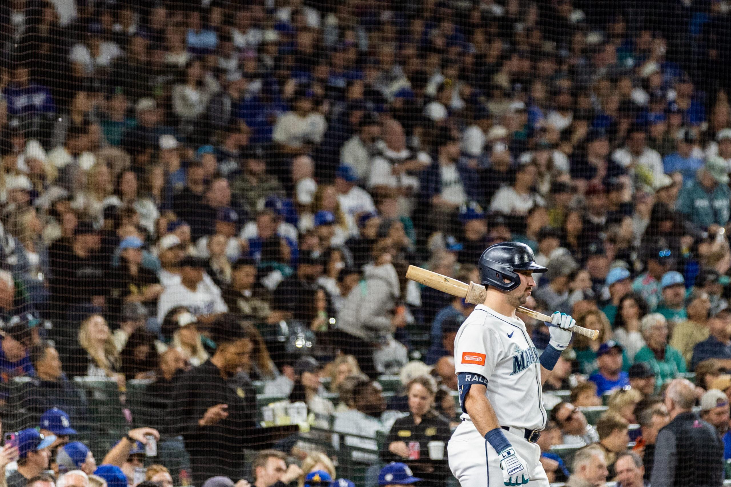 Cal Raleigh prepares to bat during a game against the Los Angeles Dodgers