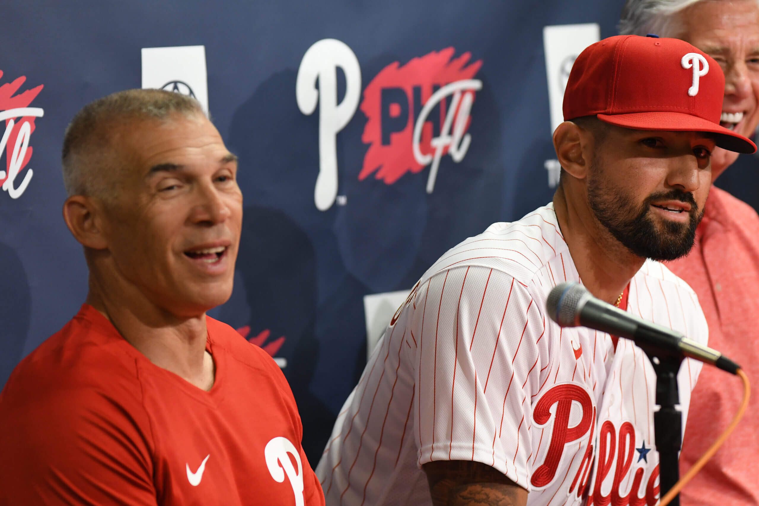 Seated between then-manager Joe Girardi and president of baseball operations Dave Dombrowski, Nick Castellanos answers questions after signing with the Phillies in March 2022. (Jonathan Dyer / Imagn Images)