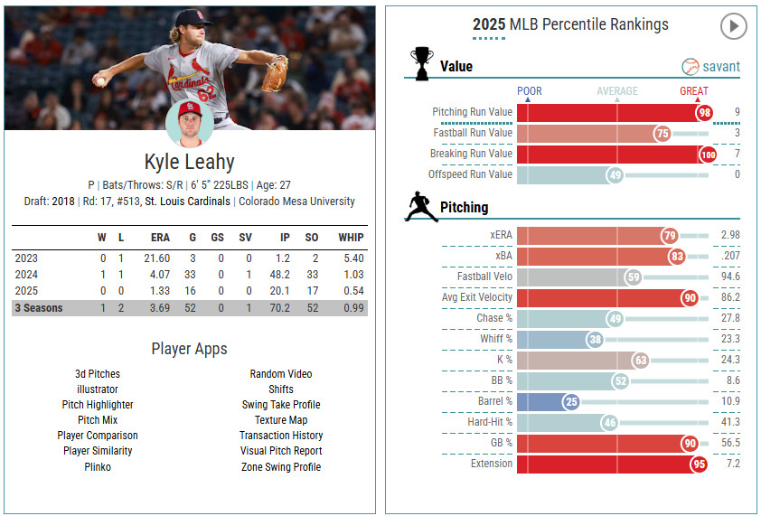 In has stepped Kyle Leahy to fill that void and rebuild that bridge from starter to Helsley that made the Cardinals bullpen so dynamic last season. So far in 2025, Leahy, has pitched 20.1 IP in 16 appearances and has pitched to a 1.33 ERA, a 2.98 xERA, a 3.71 FIP, a 3.48 xFIP, and his WOBA (weighted on base average) against is .173 which is 98th percentile in all of major league baseball. Inherited runners get stuck in cement when Leahy comes into a game with an exceptional 97.8 LOB% and his BABIP is .068. There may be some regression due in Leahy’s performance due to the high variance of luck he is experiencing. That’s not to diminish what he has accomplished so far this season. Make no mistake about it Leahy has been awesome and exactly what the Cardinals bullpen chain of command needed.