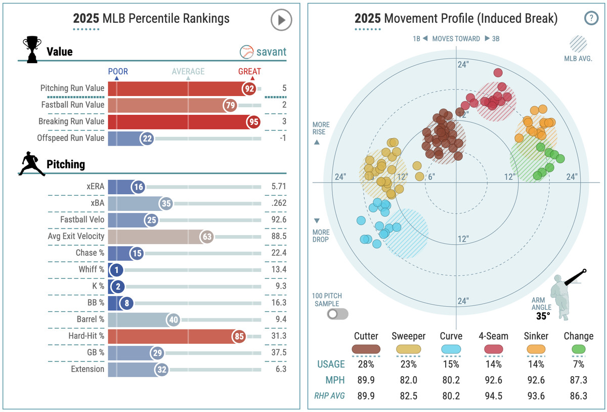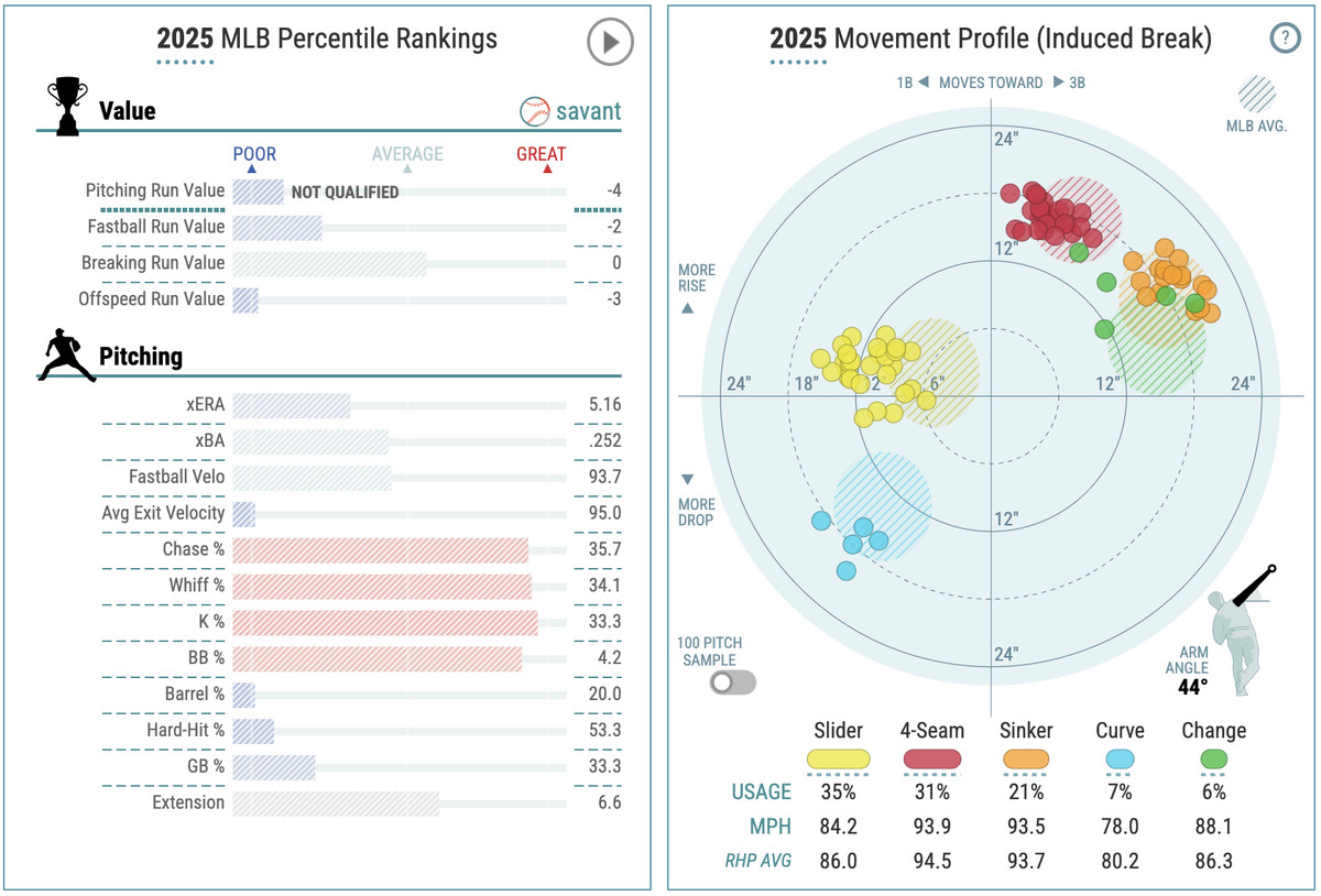 Sure, the peripherals — like his strikeout and walk percentages — are not at all impressive, but Vásquez has made it work in 2025 for the most part, largely because of the absence of home runs allowed. His season debut was a gem, tossing six scoreless innings against the Atlanta Braves on four hits and walks apiece along with three Ks.