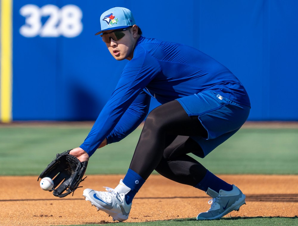 Toronto Blue Jays Kazuma Okamoto fields a ground ball at Spring Training in Dunedin, Fla. on Saturday February 14, 2026. THE CANADIAN PRESS/Frank Gunn