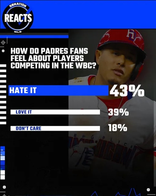 Fans of the San Diego Padres seem to have the same concerns. In this week’s Padres Reacts Survey respondents were asked how they felt about players from the San Diego roster competing in the WBC. Respondents were not unanimous in their position, but the majority said they hate that players from the Padres are competing in the WBC.
