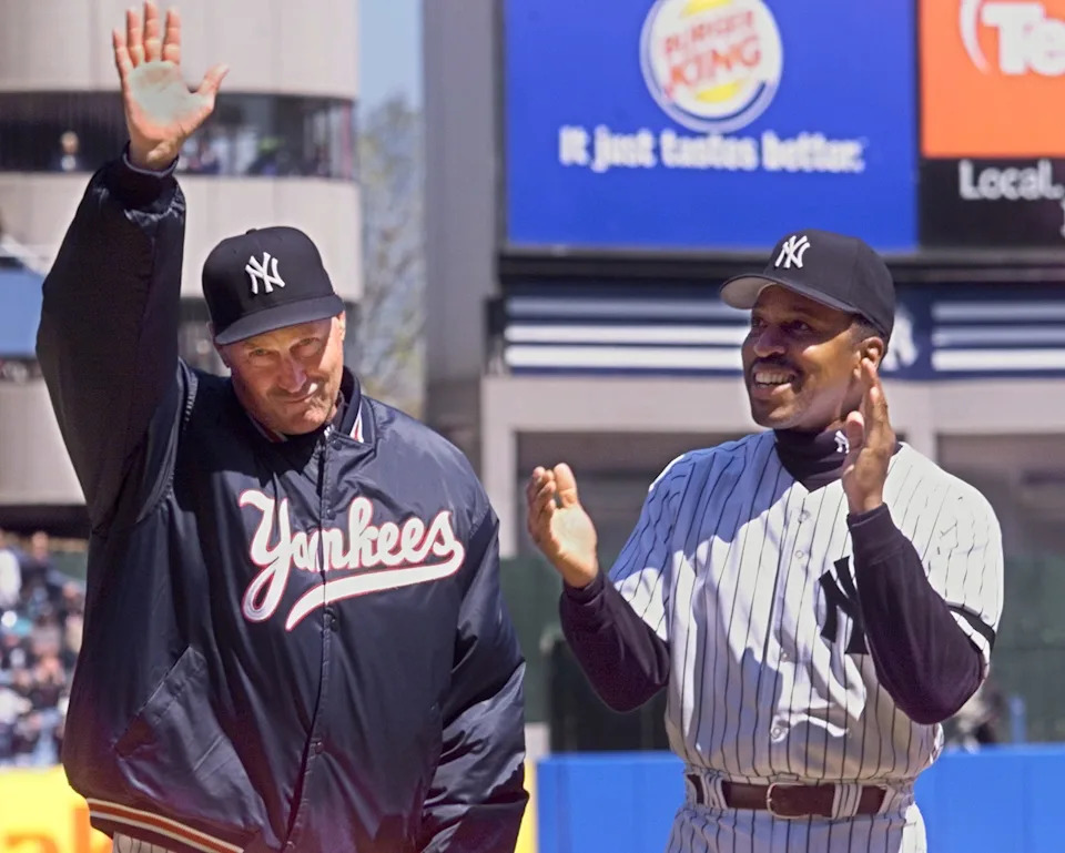 New York Yankees pitching coach Mel Stottlemyre waves in response to the ovation of the crowd at opening day ceremonies April 12 at Yankee Stadium as third base coach Willie Randolph applauds (R). The former Yankees pitching star has been diagnosed with a form of bone cancer, but plans to stay on the job while undergoing treatment.