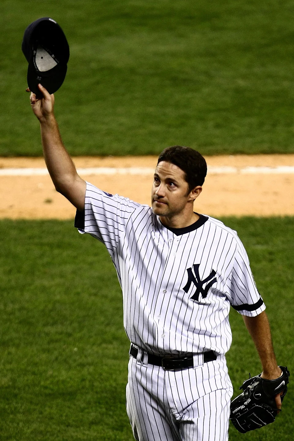 Mike Mussina of the New York Yankees waves to the crowd after being taken out of the game in the seventh inning against the Chicago White Sox on September 18, 2008 at Yankee Stadium in the Bronx.