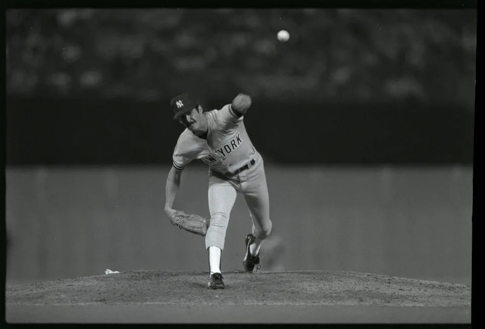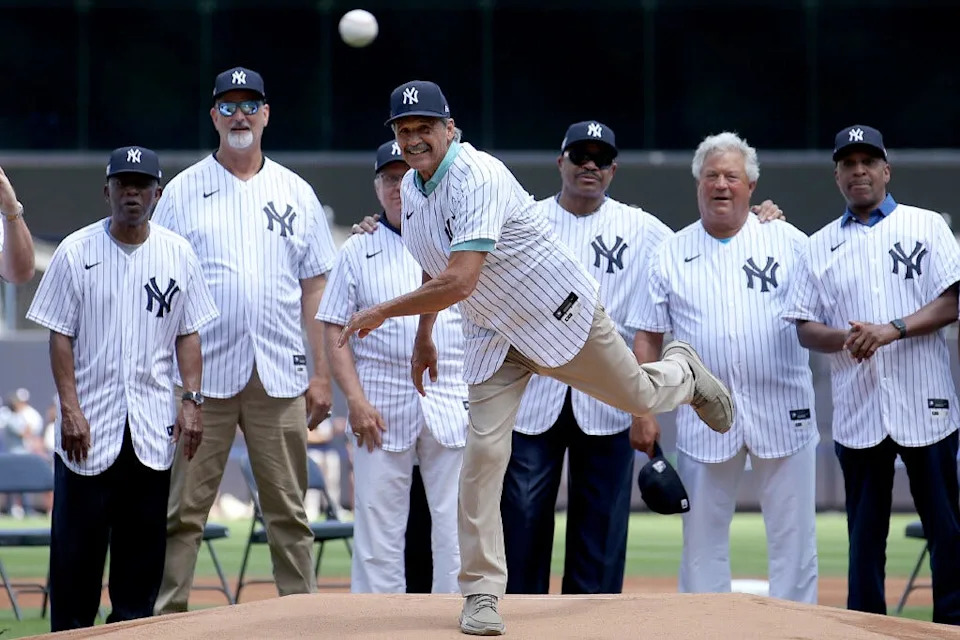 Yankees former pitcher Ron Guidry throws out a ceremonial first pitch during the old timers’ day ceremony before a game between the New York Yankees and the Kansas City Royals at Yankee Stadium in 2022. Not since the days of Reggie Jackson and Guidry in pinstripes, and Steve Garvey and Fernando Valenzuela in Dodger blue, have the two legendary franchises met in the World Series.