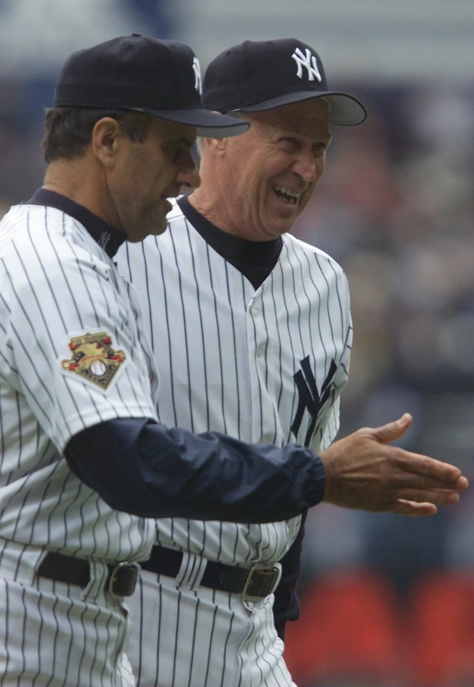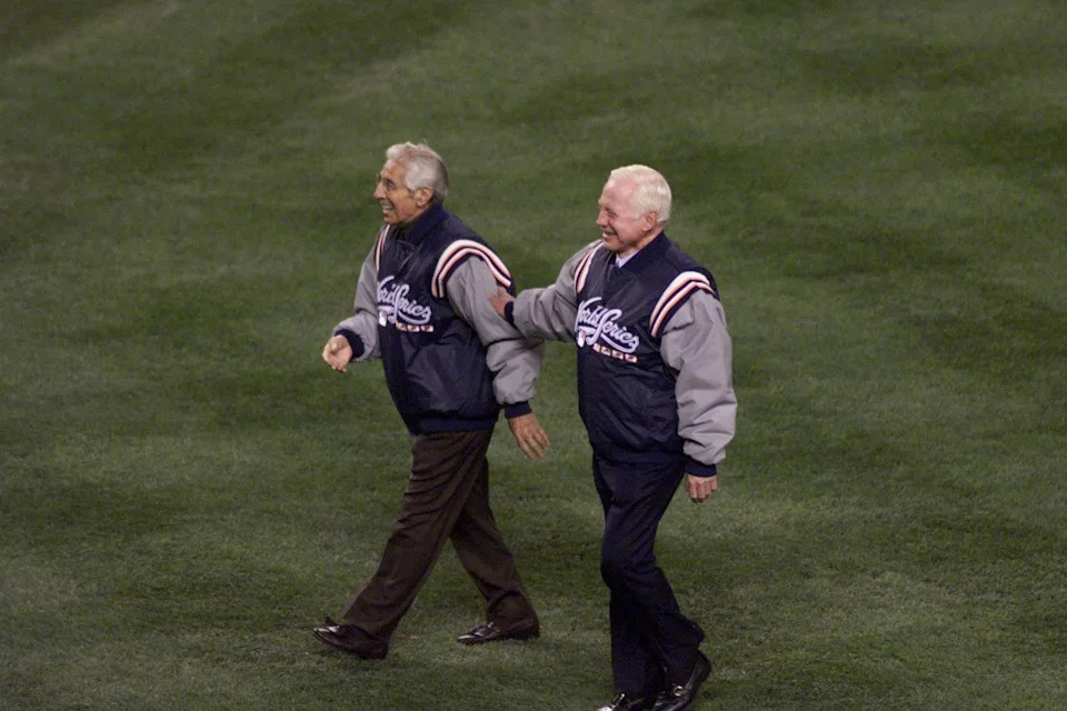 Phil Rizutto and Whitey Ford throw out the first pitch of Game 2 of the World Series on Oct. 22, 2000 at Yankee Stadium.