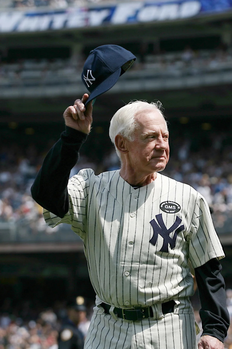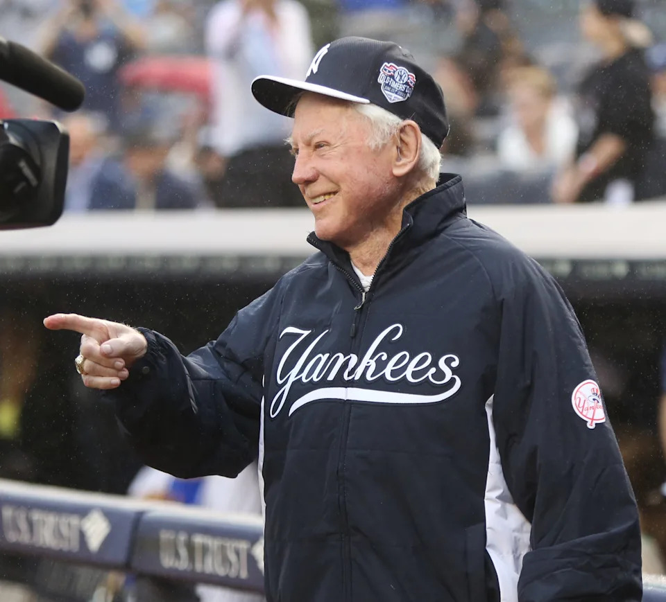 Whitey Ford is introduced during the Old Timer’s Day ceremonies at Yankee Stadium on June 20, 2015