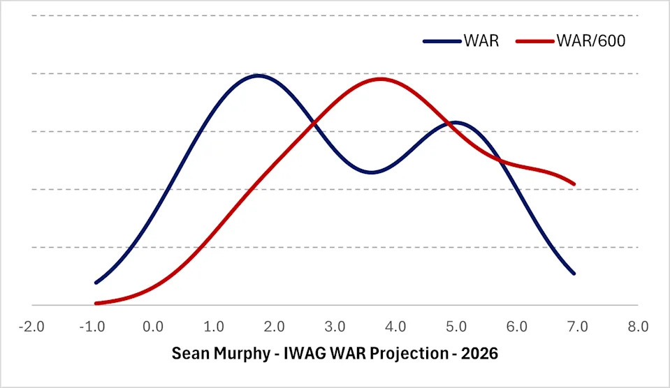 IWAG basically thinks that Murphy will, for reasons other than season-ending hip surgery that was probably needed years ago, replicate 2025. The combination of injury-affecting-performance, persistent-ish xwOBA underperformance (look at that career .327/.345 gap in over 2,000 PAs), and the mess of signals that was his 2025 season appears to be pushing towards the system’s version of a “shrug, who knows, just stick with what happened more recently.” That’s fairly consistent with Steamer (albeit with better defense) and comes in well below ZiPS, which sees more of an offensive bounceback.