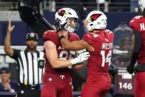 Nov 3, 2025; Arlington, Texas, USA; Arizona Cardinals tight end Trey McBride (85) celebrates with wide receiver Michael Wilson (14) after scoring a touchdown against the Dallas Cowboys in the second half at AT&T Stadium. Mandatory Credit: Kevin Jairaj-Imagn Images