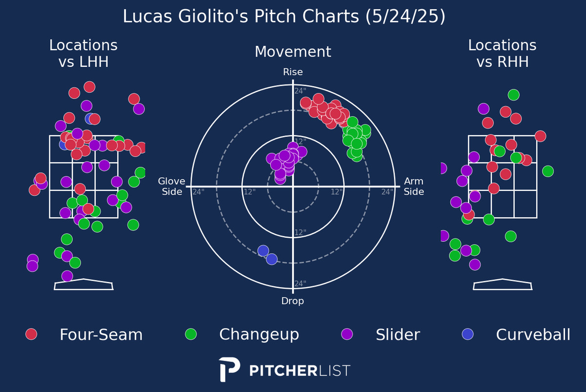Look at the fastball command against left-handed hitters. Everything is at the top of the zone, and at 93 MPH with seven feet of extension, that location is going to play. He got five whiffs on 37 pitches (13% swinging strike rate), along with several foul balls and called strikes. His slider was a bit erratic, often leaking above the zone, but it limited hard contact and was thrown for strikes. His changeup didn’t have the best day with only two whiffs; fortunately, his fastball and slider were able to carry the load. The slowball is his bread and butter, so I’d bet it shows up again in his next outing. Let’s take a look at how it looked in action, starting with the first inning.