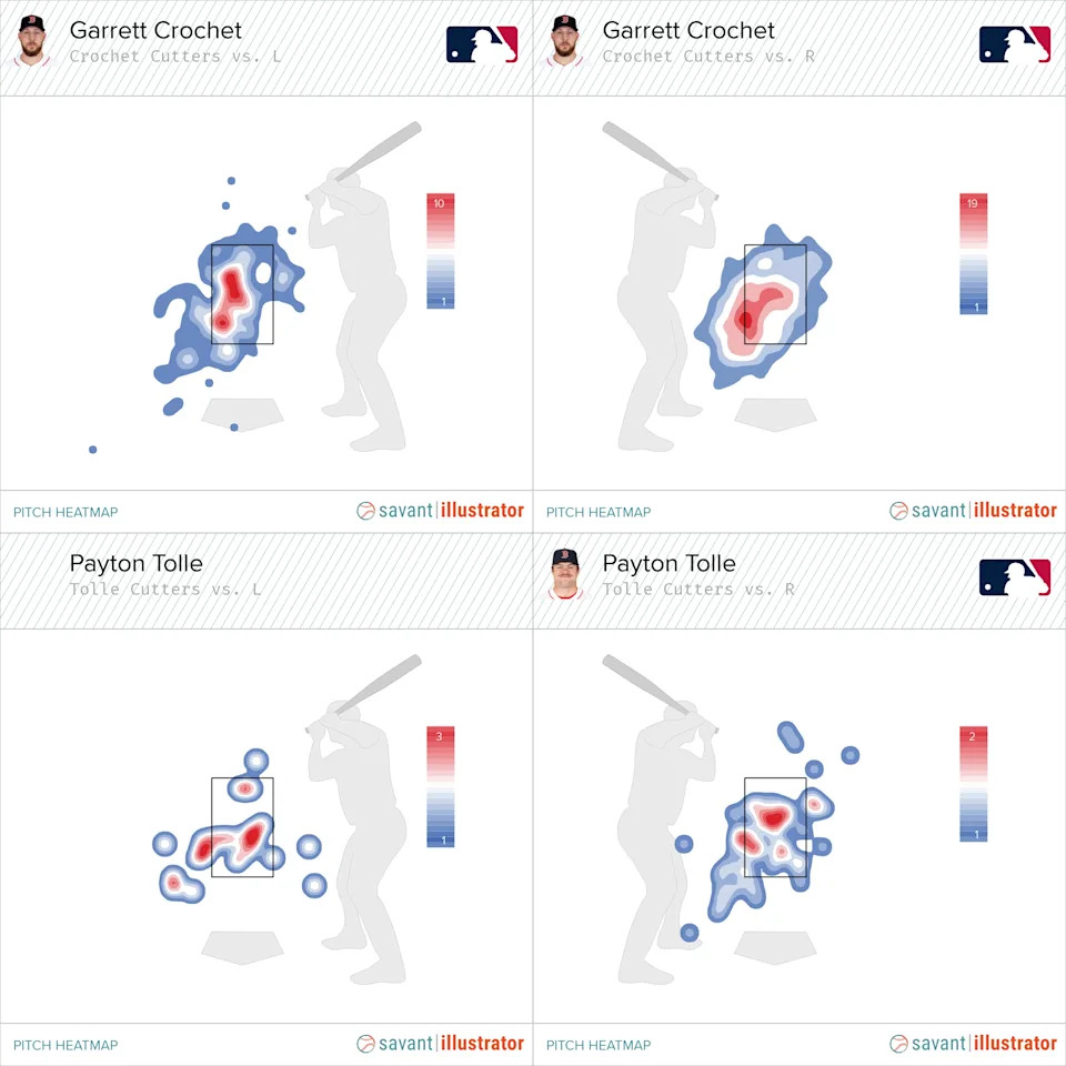 In 2024, Garrett Crochet put together a solid season using 54% four-seams and 28% cutters. He mixed in other pitches as well, but the two fastballs accounted for most of his arsenal. You can succeed with just two pitches, but you have to be able to locate them. Crochet spotted his cutter inside to righties and away from lefties consistently. Tolle’s cutter heatmap looked more like a Rorschach test than a game plan. Against righties in particular, Tolle’s cutters found the middle of the plate far too often. If he wants to live with two pitches, he has to locate them well.