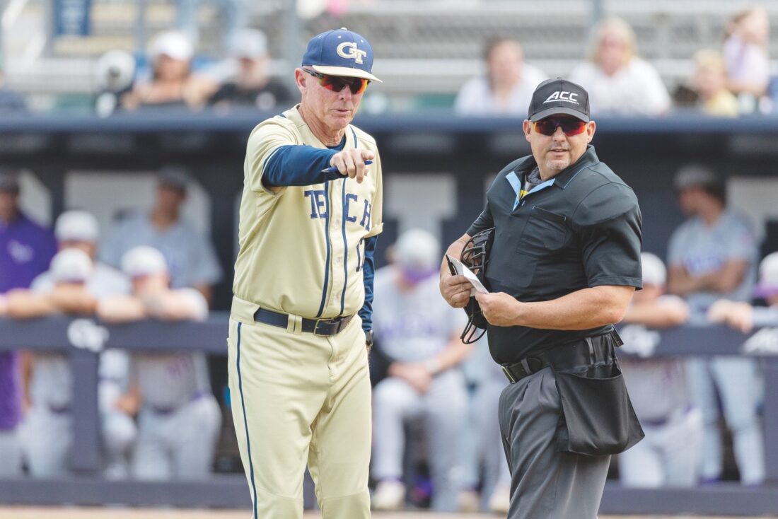 Georgia Tech head coach Danny Hall talks with an umpire during an NCAA baseball game against Western Carolina on Sunday, May 4, 2025, in Atlanta. (AP Photo/Vasha Hunt)