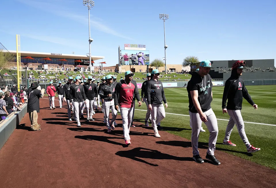 The Arizona Diamondbacks take the field against the Colorado Rockies during the spring training season opener at Salt River Fields on Feb. 20, 2026, in Scottsdale.