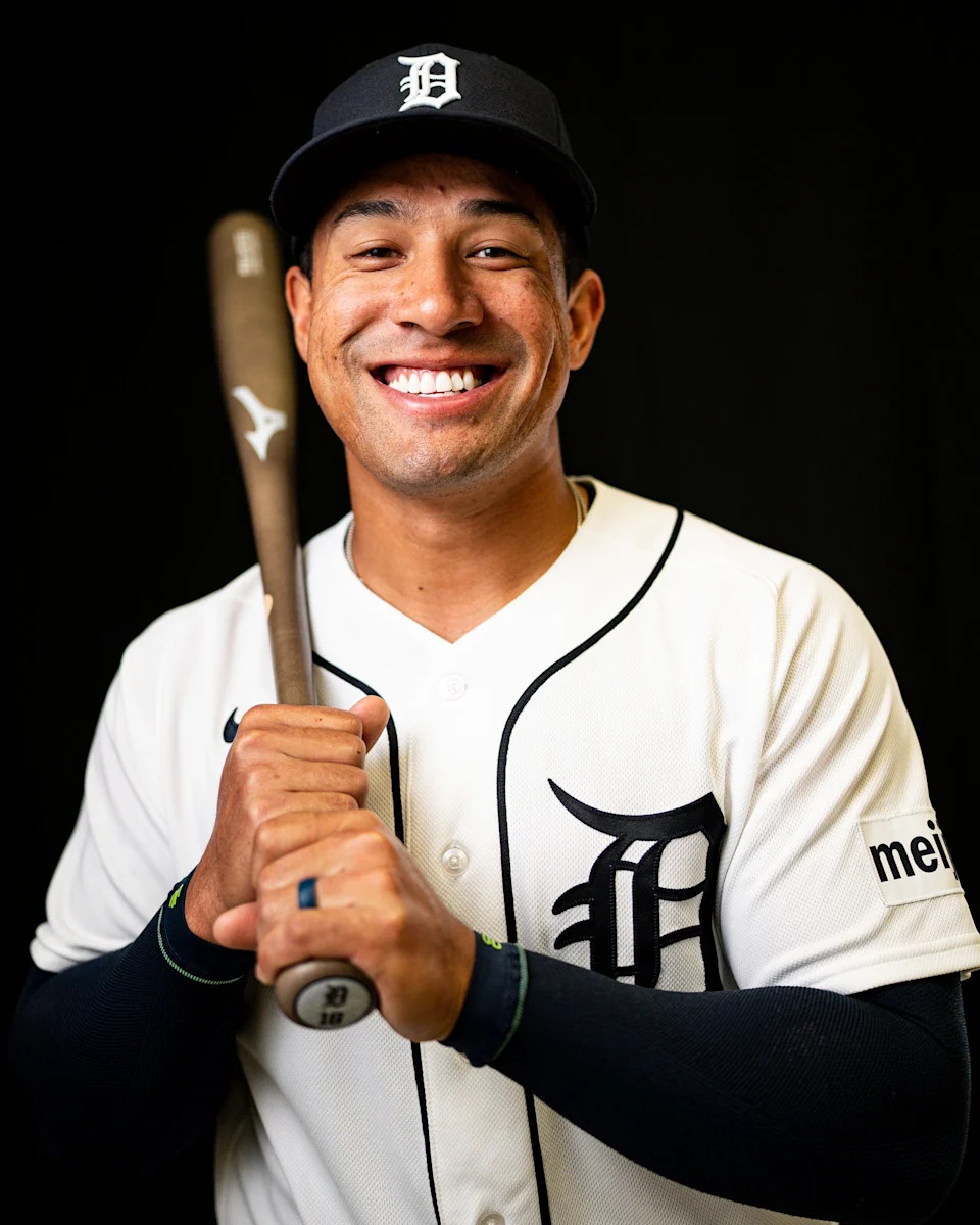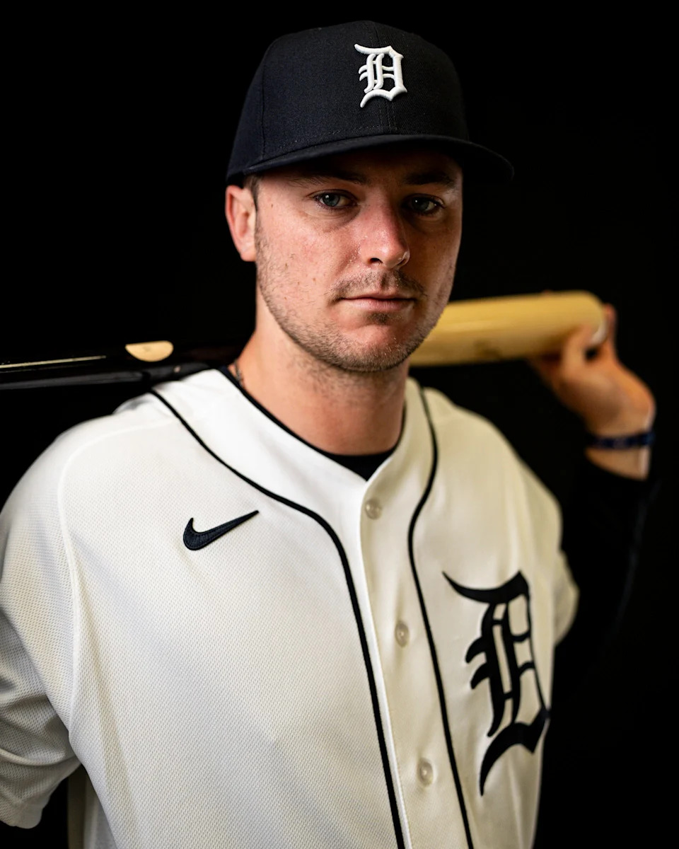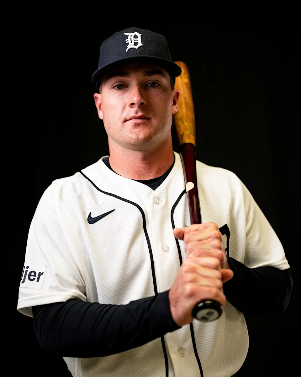 Detroit Tigers outfielder Kerry Carpenter on picture day during spring training at TigerTown in Lakeland, Fla. on Tuesday, Feb. 17, 2026.