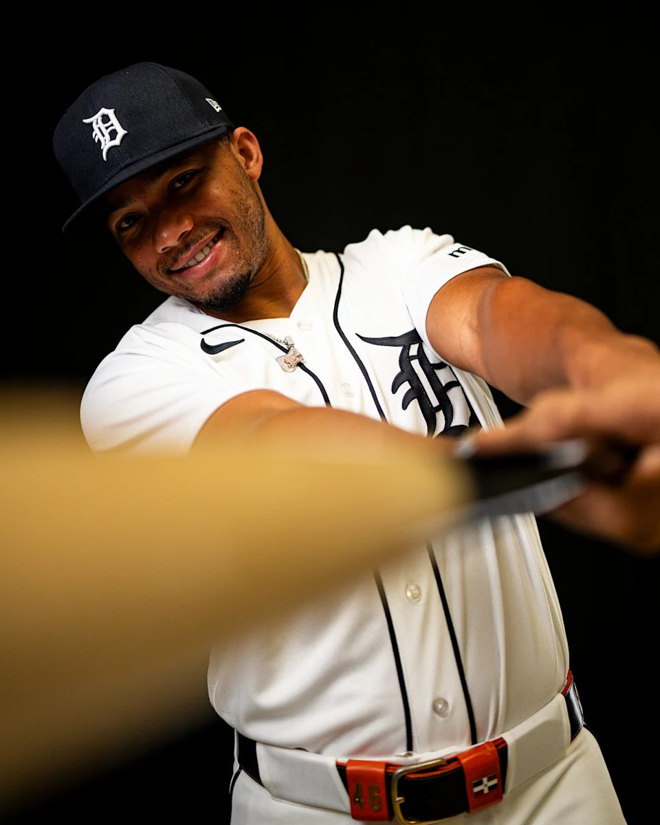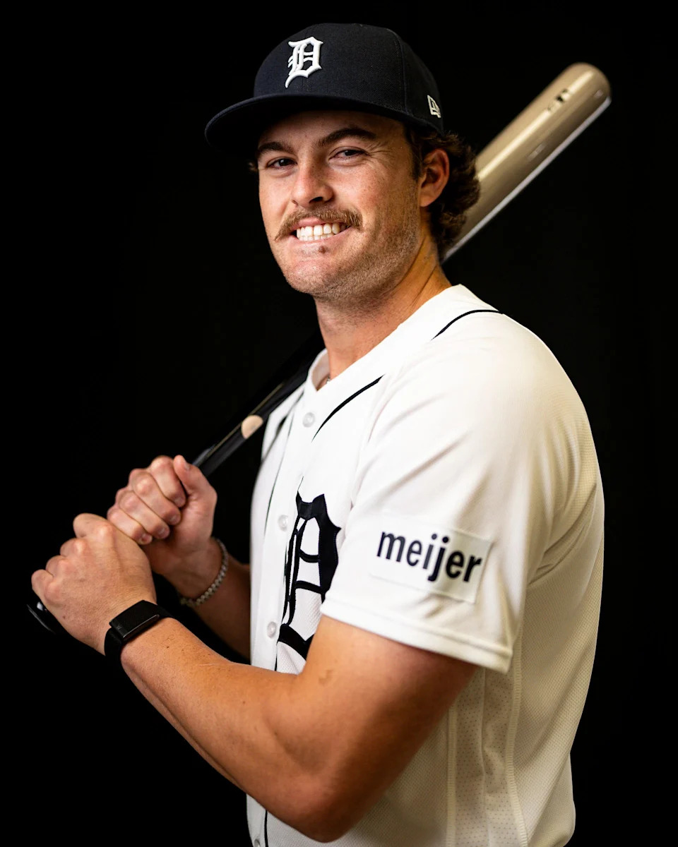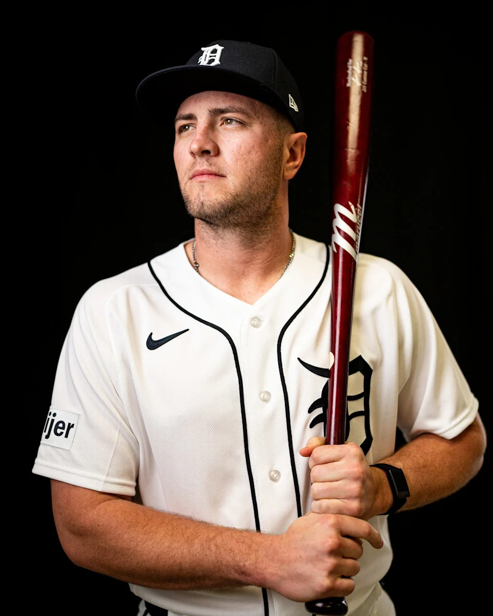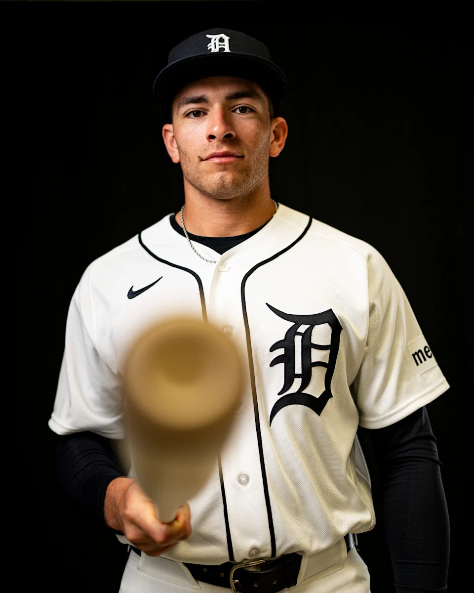 Detroit Tigers outfielder Kerry Carpenter on picture day during spring training at TigerTown in Lakeland, Fla. on Tuesday, Feb. 17, 2026.