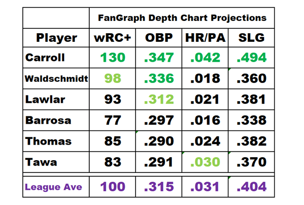 FanGraph Depth Chart projections show two Diamondback outfielders with above average power: Corbin Carroll and Lourdes Gurriel Jr. (proj-SLG>.404 and proj-HR/PA>.031). Because they are injured, their above-average power is not assumed. What is assumed is they will play on the outfield corners when they return from the injured list. The biggest question is who will play center field.