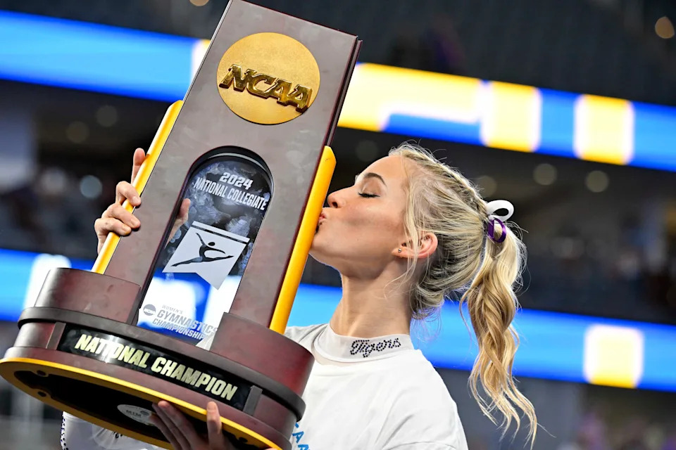 Olivia Dunne poses with the trophy after the LSU Tigers gymnastics team wins the national championship in the 2024 Women’s National Gymnastics Championship.