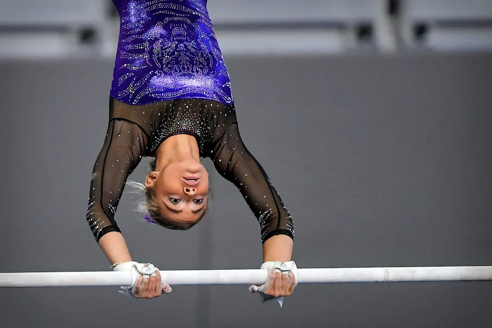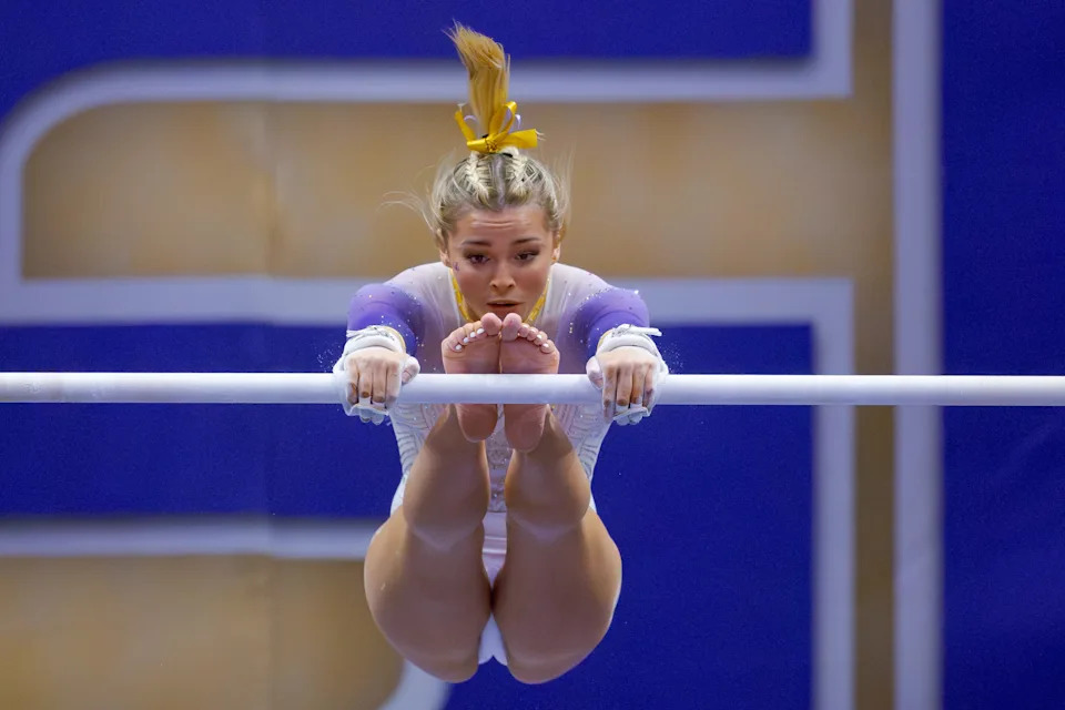 Olivia Dunne warms up on uneven bars before the start of the 2024 Women’s National Gymnastics Championship at Dickies Arena.
