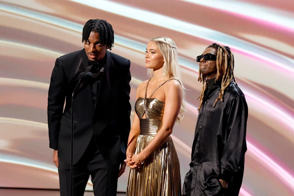 Jayden Daniels, Livvy Dunne and Lil Wayne on stage during the 2024 ESPY Awards.