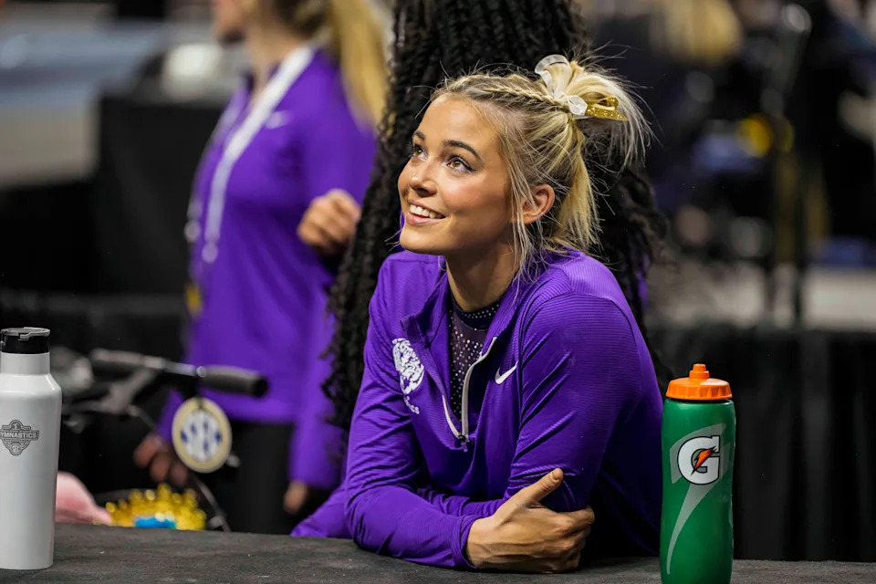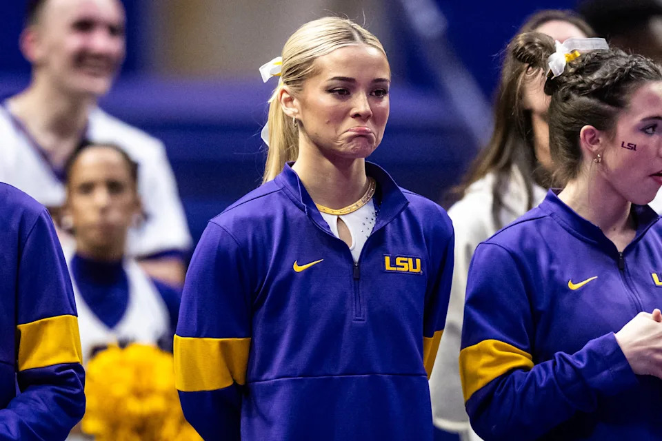Olivia Dunne looks on against the Florida Gators before a meet in 2024.