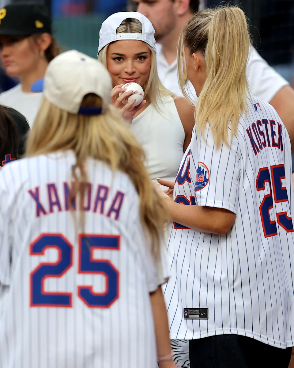 Livvy Dunne (center) on the field with models Alexandra Pohl and Camille Kostek before a game between the New York Mets and the Pittsburgh Pirates at Citi Field.