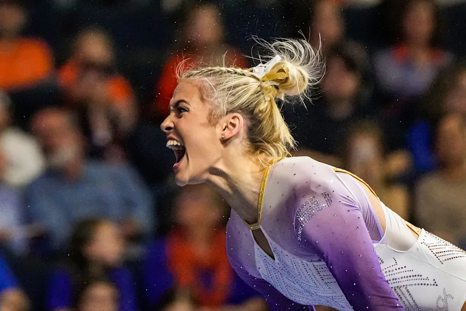 Livvy Dunne cheers for the LSU gymnastic team during during the 2025 NCAA gymnastics semifinals.