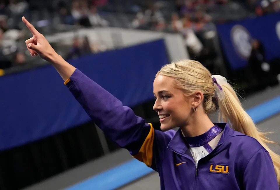 Livvy Dunne gestures to fans during Session 2 of the SEC Gymnastics Championship at Legacy Arena in Birmingham, Alabama in 2025.