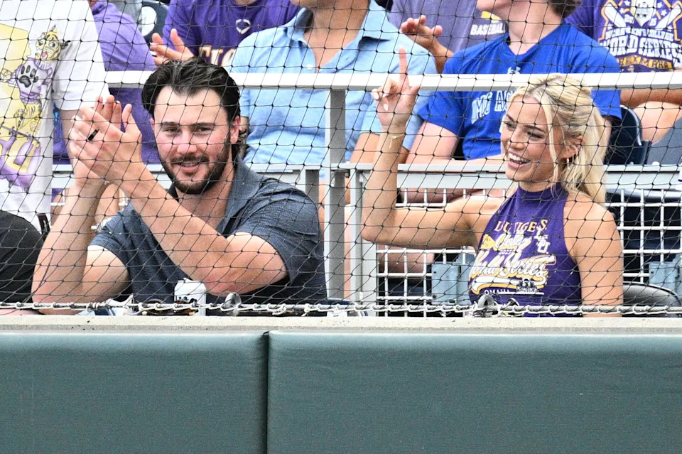 Pittsburgh Pirates pitcher and former LSU baseball player Paul Skenes and girlfriend Livvy Dunne watch the College World Series game between UCLA and LSU at Charles Schwab Field on June 16, 2025.