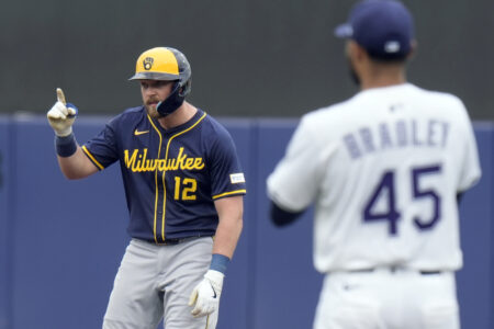 Milwaukee Brewers’ Rhys Hoskins (12) reacts after his double off Tampa Bay Rays pitcher Taj Bradley (45) during the second inning of a baseball game Saturday, May 10, 2025, in Tampa, Fla. (AP Photo/Chris O’Meara)