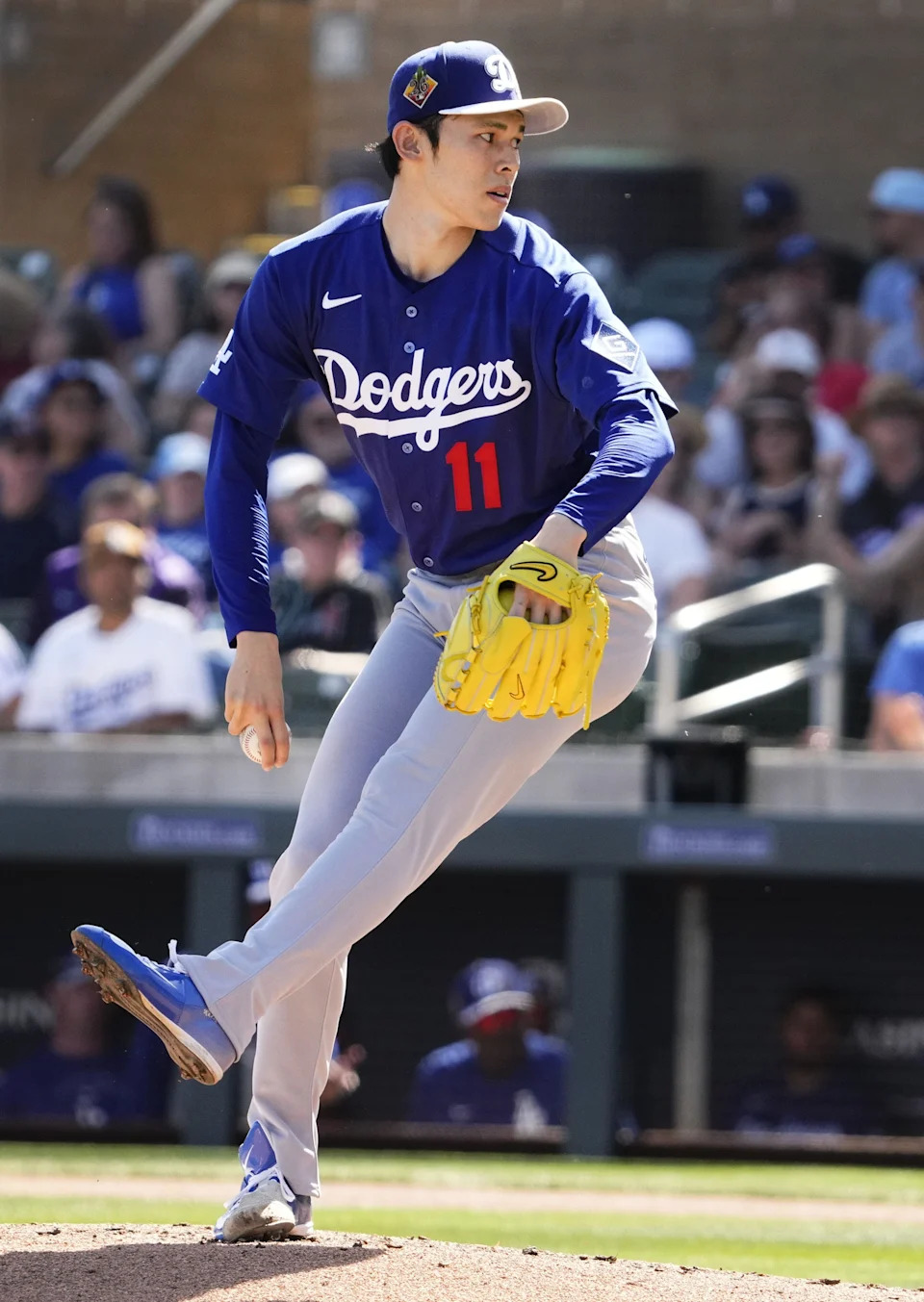 Los Angeles Dodgers pitcher Roki Sasaki (11) throws to the Arizona Diamondbacks in the first inning on Feb. 25, 2026, at Salt River Fields in Scottsdale.