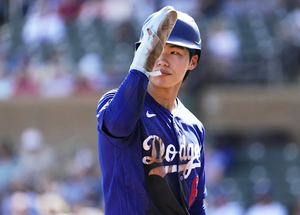 Los Angeles Dodgers pitcher Roki Sasaki (11) reacts after walking Arizona Diamondbacks Tim Tawa (13) in the first inning on Feb. 25, 2026, at Salt River Fields in Scottsdale.