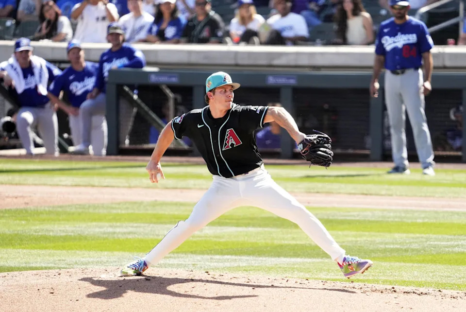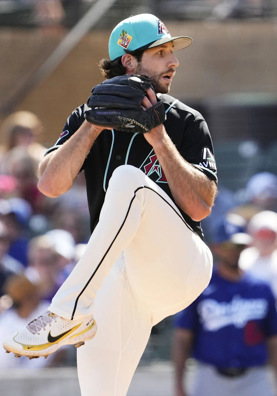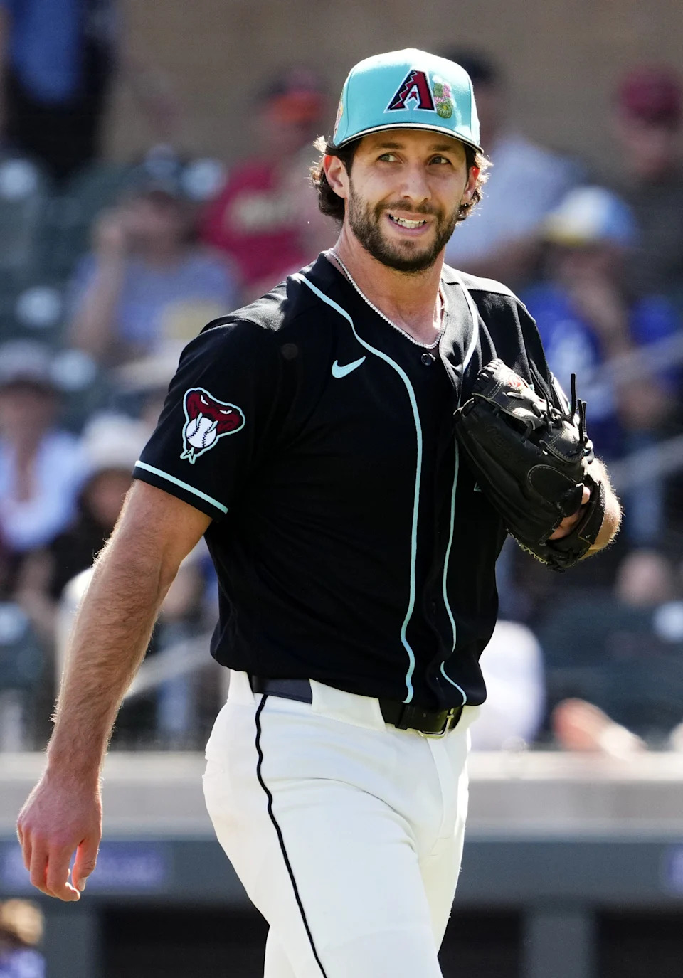 Arizona Diamondbacks pitcher Zac Gallen (23) reacts after facing the Los Angeles Dodgers in the first inning on Feb. 25, 2026, at Salt River Fields in Scottsdale.