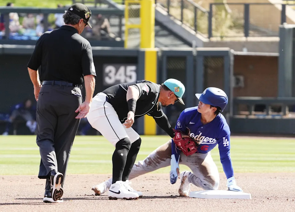 Los Angeles Dodgers second baseman Hyeseong Kim (6) steals second against Arizona Diamondbacks second baseman Ildemaro Vargas (6) in the first inning on Feb. 25, 2026, at Salt River Fields in Scottsdale.