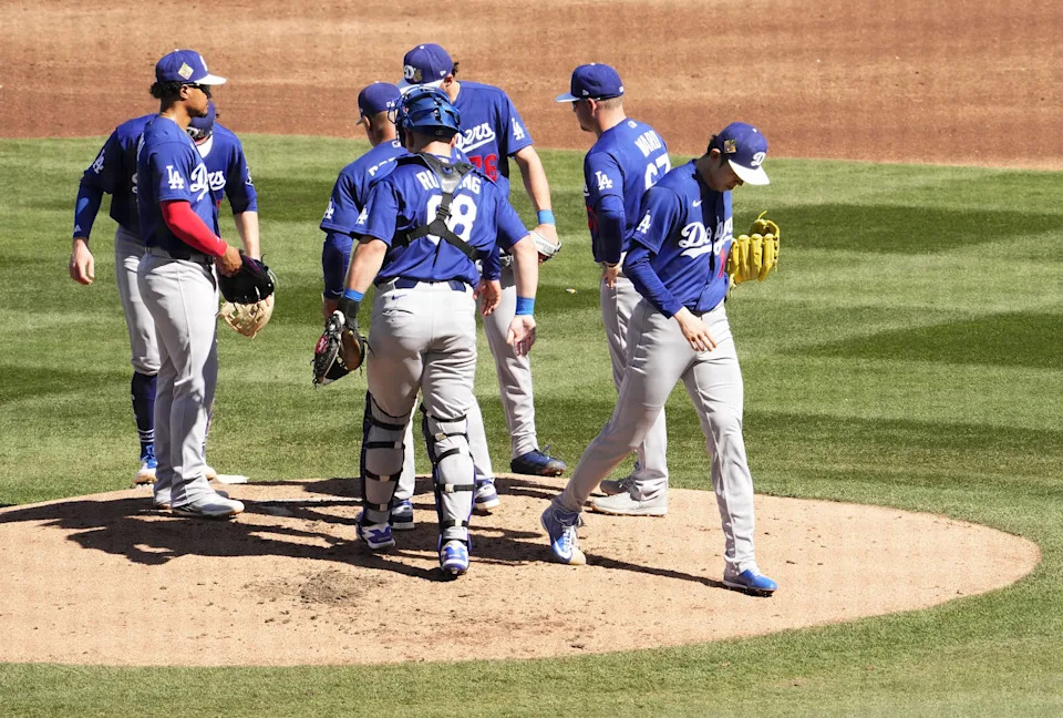 Los Angeles Dodgers pitcher Roki Sasaki (11) leaves the game against the Arizona Diamondbacks in the second inning on Feb. 25, 2026, at Salt River Fields in Scottsdale.