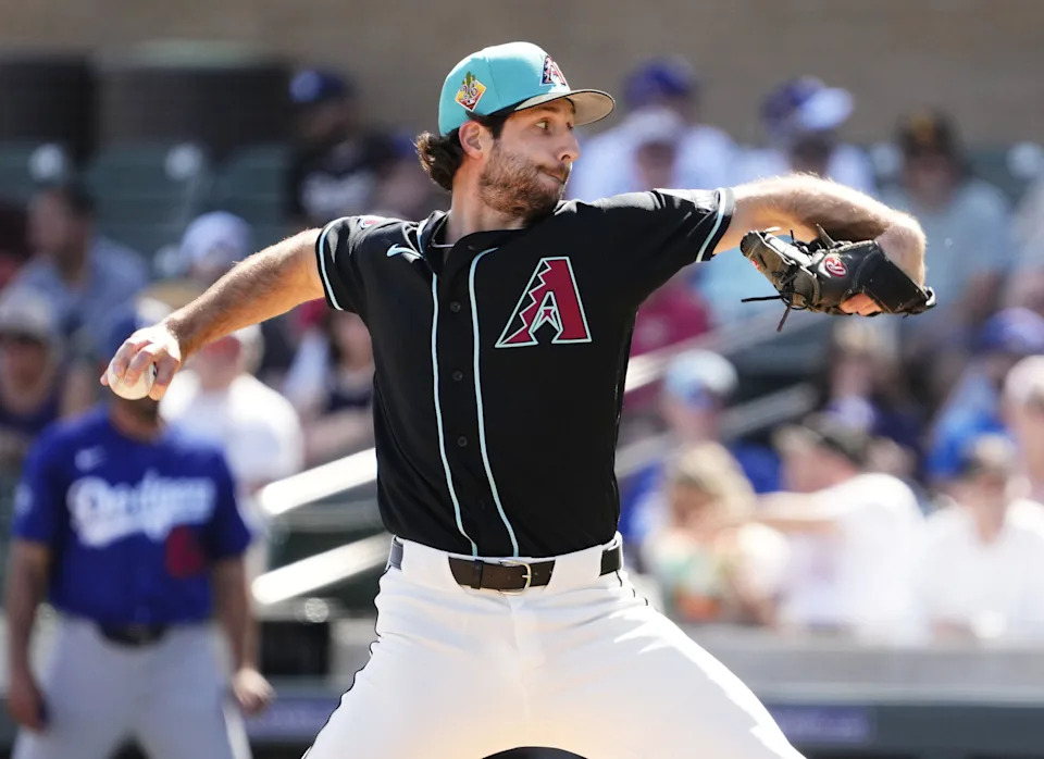 Arizona Diamondbacks pitcher Zac Gallen (23) throws to the Los Angeles Dodgers in the first inning on Feb. 25, 2026, at Salt River Fields in Scottsdale.