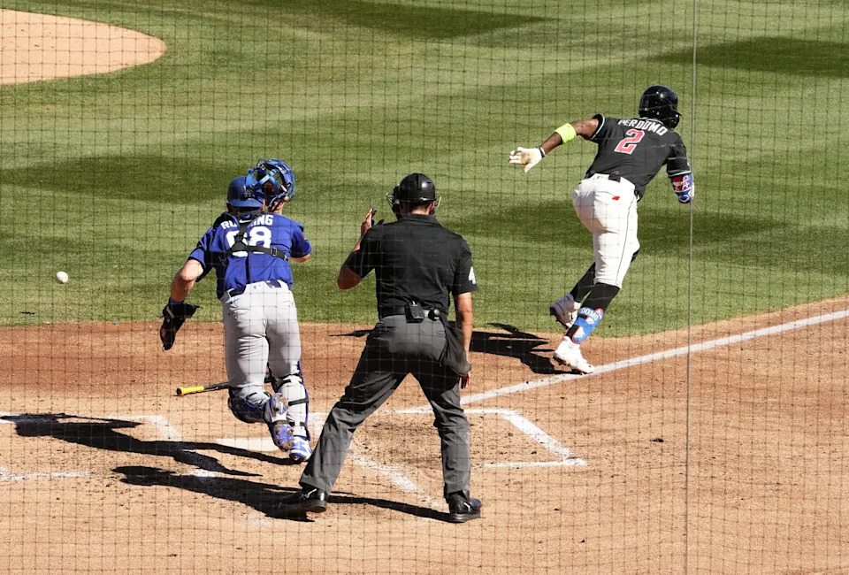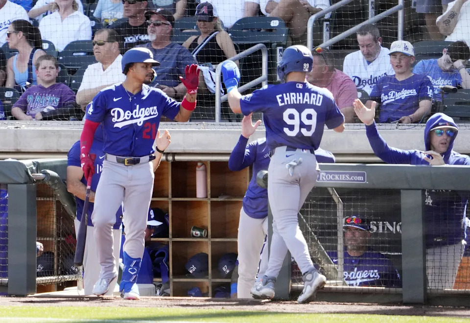 Los Angeles Dodgers’ Zach Ehrhard (99) reacts after scoring against the Arizona Diamondbacks in the second inning on Feb. 25, 2026, at Salt River Fields in Scottsdale.