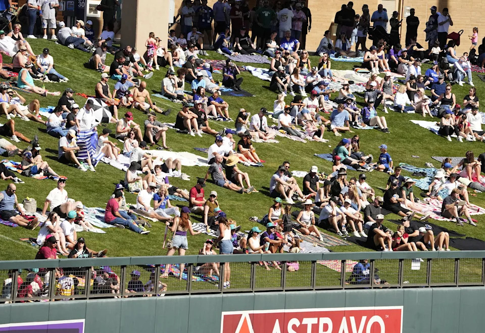 Fans fill the left field lawn in the third inning to watch the Dodgers play the D-Backs on Feb. 25, 2026, at Salt River Fields in Scottsdale.