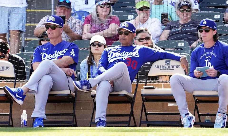 Los Angeles Dodgers manager Dave Roberts (30) watches the action against the Arizona Diamondbacks in the first inning on Feb. 25, 2026, at Salt River Fields in Scottsdale.