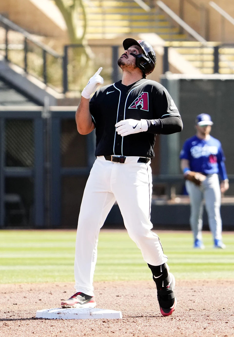 Arizona Diamondbacks’ Nolan Arenado (28) reacts after hitting an RBI-double against the Los Angeles Dodgers in the first inning on Feb. 25, 2026, at Salt River Fields in Scottsdale.